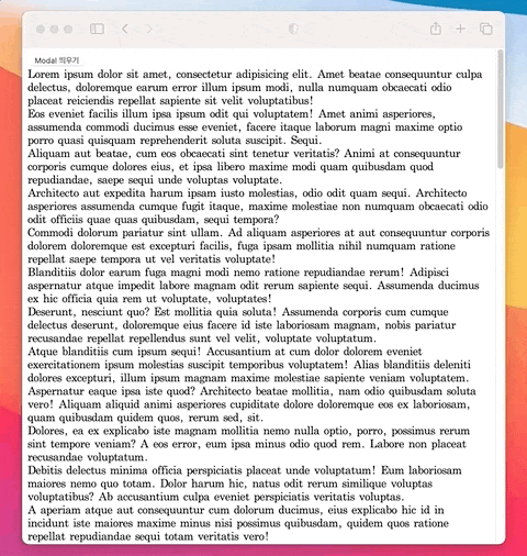 <body>가 포함하고 있는 본문 내용이 브라우저의 크기보다 많아지면, 화면에서는 자동으로 스크롤을 추가해 브라우저 영역을 벗어난 <body>를 볼 수 있게 합니다. 이런 경우에 모달이 화면에 띄워지면 모달에서 발생한 마우스 스크롤 이벤트가 <body>에서 동작하는 문제가 있습니다. 이 문제를 해결하기 위해서는 모달이 on/off 되는 상황에 따라 body의 스크롤을 사용하지 못하도록 해야 합니다.