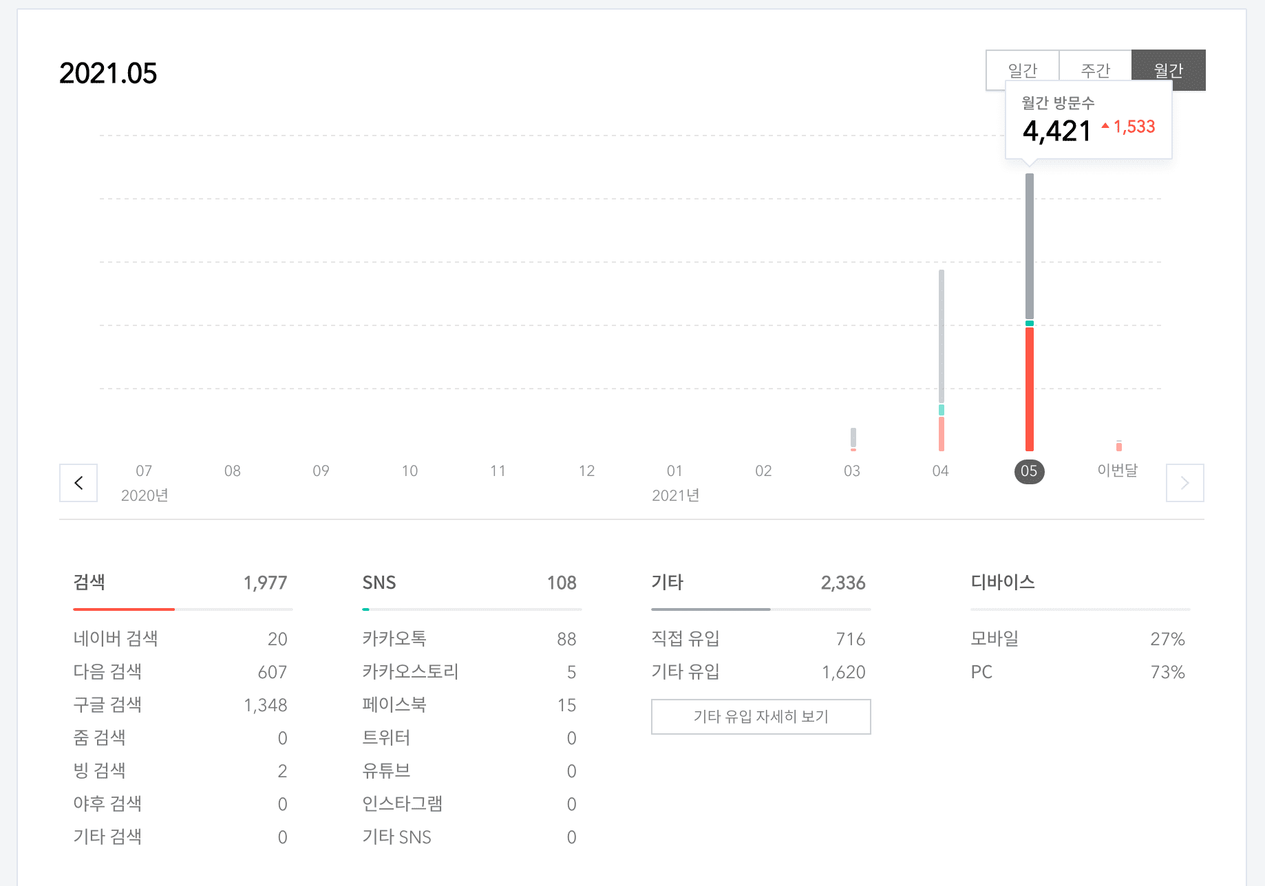 지난 4월에 블로그 방문객은 총 2,888명이고 5월의 블로그 방문객 수는 총 4,421명입니다. 그림에도 나와있지만 이전 달에 비해 방문객이 1,533명 늘어났음을 알 수 있습니다. 개인적인 생각으로는 총 방문객 수보다 중요한 지표는 검색을 통해 유입된 방문자수라고 생각합니다.