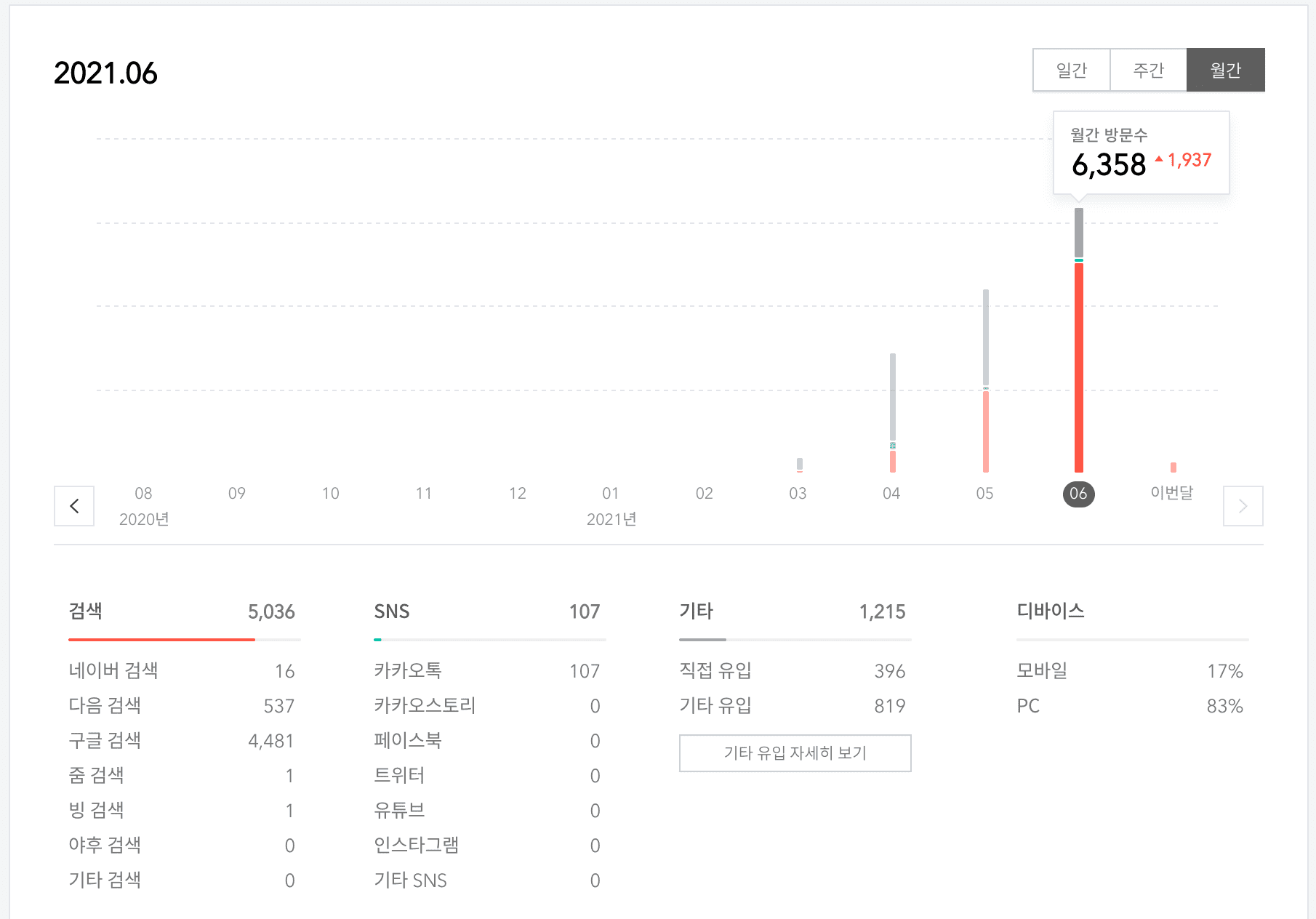 지난 5월에 블로그 방문객은 총 4,421명이고 6월의 블로그 방문객 수는 총 6,358명입니다. 5월과 6월을 비교하면 방문객이 1,937명 늘어났습니다. 5월에 늘어난 유입량 1,533명과 대비해서 많이 늘어나지는 않았지만, 3주라는 공백기를 감안한다면 좋은 수치라고 생각됩니다. 실제 6월의 운영 공백기가 반영될 7월달의 수치가 어떨지 궁금합니다.