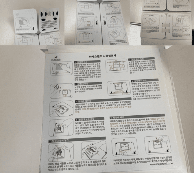 비닐을 제거하면 영어로 작성된 매뉴얼이 있습니다. 영어로 작성된 매뉴얼이 불편하시다면 접힌 부분을 모두 풀어 한글로 작성된 매뉴얼을 확인해 노트북에 마제스탠드를 붙이시면 됩니다.