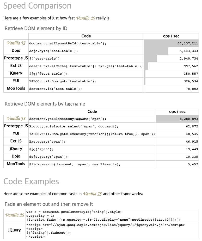 Vanilla-js 웹 사이트에는 바닐라 자바스크립트와 jQuery를 비교한 내용을 게시해놓았다. 명령어를 수행하는 속도와 사용하는 코드를 예로 들어 차이점을 이야기한다. 바닐라 스크립트의 정의처럼 비교 결과는 바닐라 스크립트가 jQuery에 비해 유용하다고 보여준다.