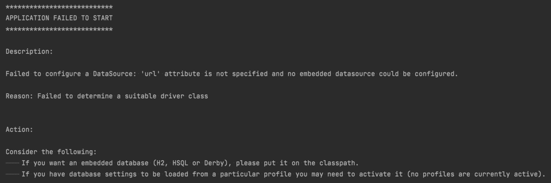 Failed to configure a DataSource 에러가 발생하는 이유는 Database에 연결할 때 필요한 정보가 없기 때문이다. 주로 스프링 프레임워크를 이용해 프로젝트를 구성하는 초기에 발생하는 문제이다. 간혹 모르고 application.properties 파일이나 application.yml 파일과 같은 설정 파일을 삭제하거나 위치를 옮겼을 때에도 볼 수 있는 현상이다.
