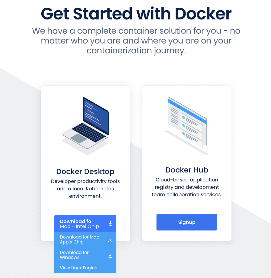 도커는 엑셀과 같이 운영체제 위에서 돌아가는 하나의 프로그램입니다. 그렇기 때문에 도커를 설치하지 않으셨다면, 공식 사이트를 방문해 도커를 다운하여 설치해주세요. 설치방법은 일반적인 응용프로그램처럼 다운로드 받아 실행을 시키시면 됩니다.