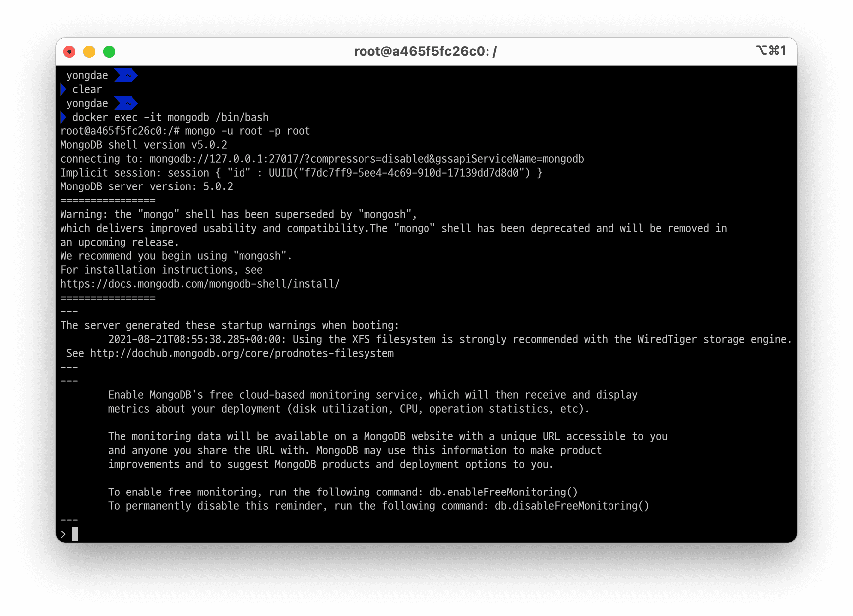위의 명령어를 입력할 때는 MongoDB 컨테이너를 만들 때 사용한 사용자 이름과 패스워드를 입력하시면 됩니다. 예시로 드린 명령어에서는 사용자는 "root" 비밀번호는 "root"입니다.