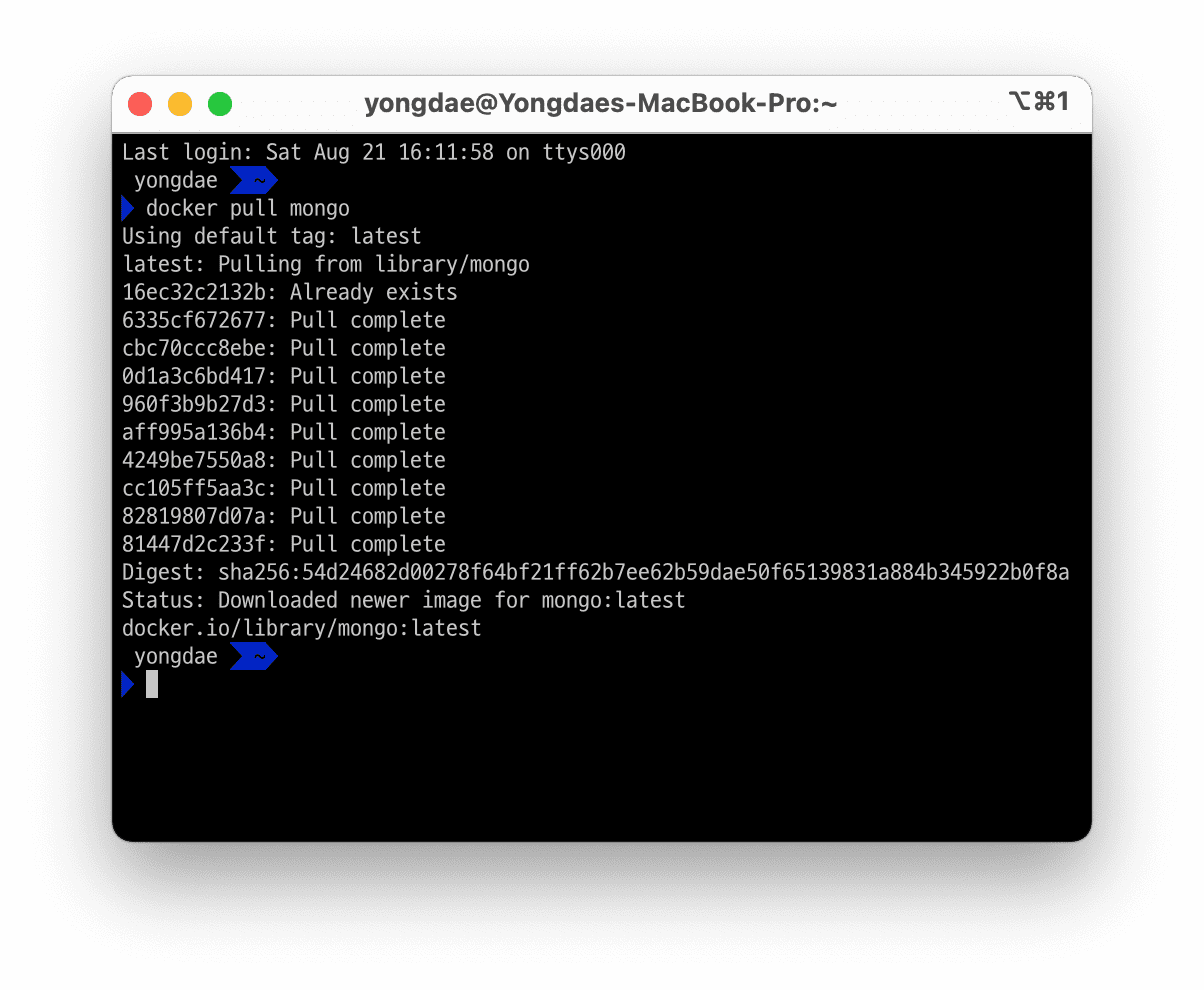 명령어를 입력해서 실행하시면 Docker hub에 있는 MongoDB 이미지를 사용자 컴퓨터에 다운 받아 사용할 수 있습니다.