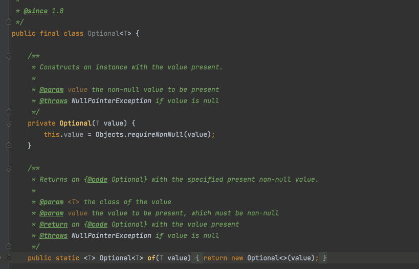 자바 1.8부터 제공된 Optional은 정적 팩토리 메서드를 정석으로 보여주는 객체입니다. 앞서 정적 팩토리 메서드는 객체를 생성하는 메서드라고 정의했었는데 Optional은 "new" 키워드 대신 "of()" 메서드를 이용해 객체를 만들 수 있게 설계되어있습니다. 이제 메서드가 객체를 생성한다라는 개념이 무엇인지 조금은 감히 잡히지 않나요?
