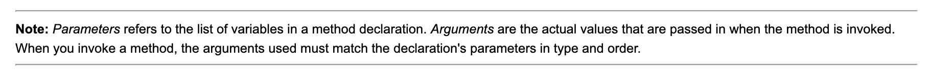 위의 내용을 해석하면 다음과 같습니다. "매개변수는 메서드 선언의 변수 목록을 나타냅니다. 인수는 메서드가 호출될 때 전달되는 실제 값입니다." 모든 프로그래밍 언어에서 이와 같이 매개변수(Parameter)와 인수(Argument)가 정의된다고 단정 지을 수는 없지만 프로그래밍 전반에 있어서는 큰 무리 없이 사용할 수 있는 정의라고 생각합니다.