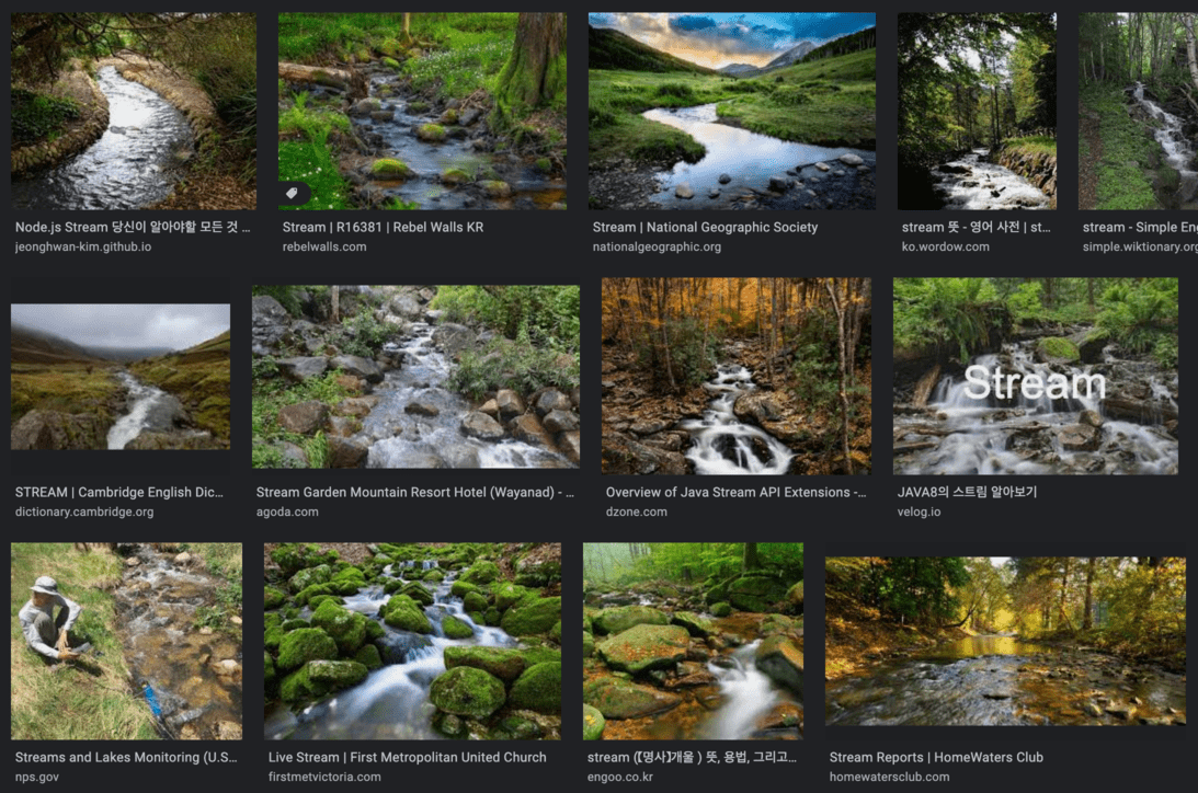 자바의 컬렉션을 다루는 스트림 API에 대해 알아보기 이전에 먼저 스트림(Stream)에 대한 개념을 구체화시켜보도록 하겠습니다. 먼저 스트림을 생각하면 어떤 연상되는 이미지가 있으신가요? 구글을 통해 stream을 검색하면 아래와 같은 이미지들을 찾을 수 있습니다.