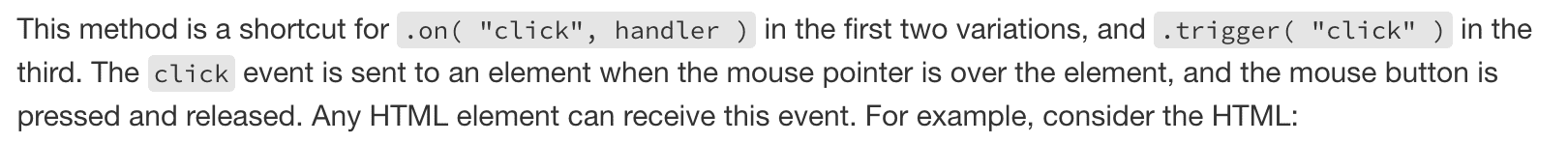 jQuery 공식 홈페이지를 보면 click()은 on('click', handler)을 축약시켜 쓰는 shortcut라고 이야기합니다. 결국 click()과 on() 다르지 않다는 이야기입니다. 그러면 왜 차이가 발생하는 것일까요? on()과 click()의 차이점은 '선택자'의 유무입니다.