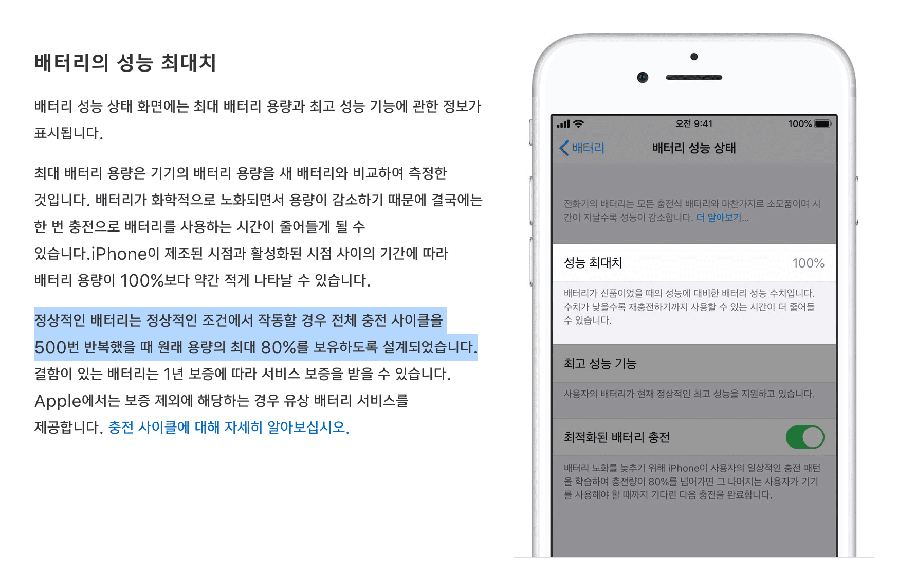 배터리는 소모품에 해당하는 전자 제품 부품입니다. 따라서 사용 시간이 지남에 따라 노후화되고, 새것으로 교체해야 하는 부품입니다. 사람마다 사용 빈도가 달라 차이가 있지만 배터리의 수명은 2 ~ 3년 정도로 이야기합니다. 아이폰의 경우에는 설정 > 배터리 > 배터리 성능 상태를 확인하면 배터리의 수명을 확인할 수 있습니다. 애플 공식 홈페이지에서는 성능 최대치가 80% 이하인 경우 교체할 것을 권장합니다. 참고로 애플 제품들은 배터리 효율이 80% 이하가 되기가 생각보다 어렵습니다.