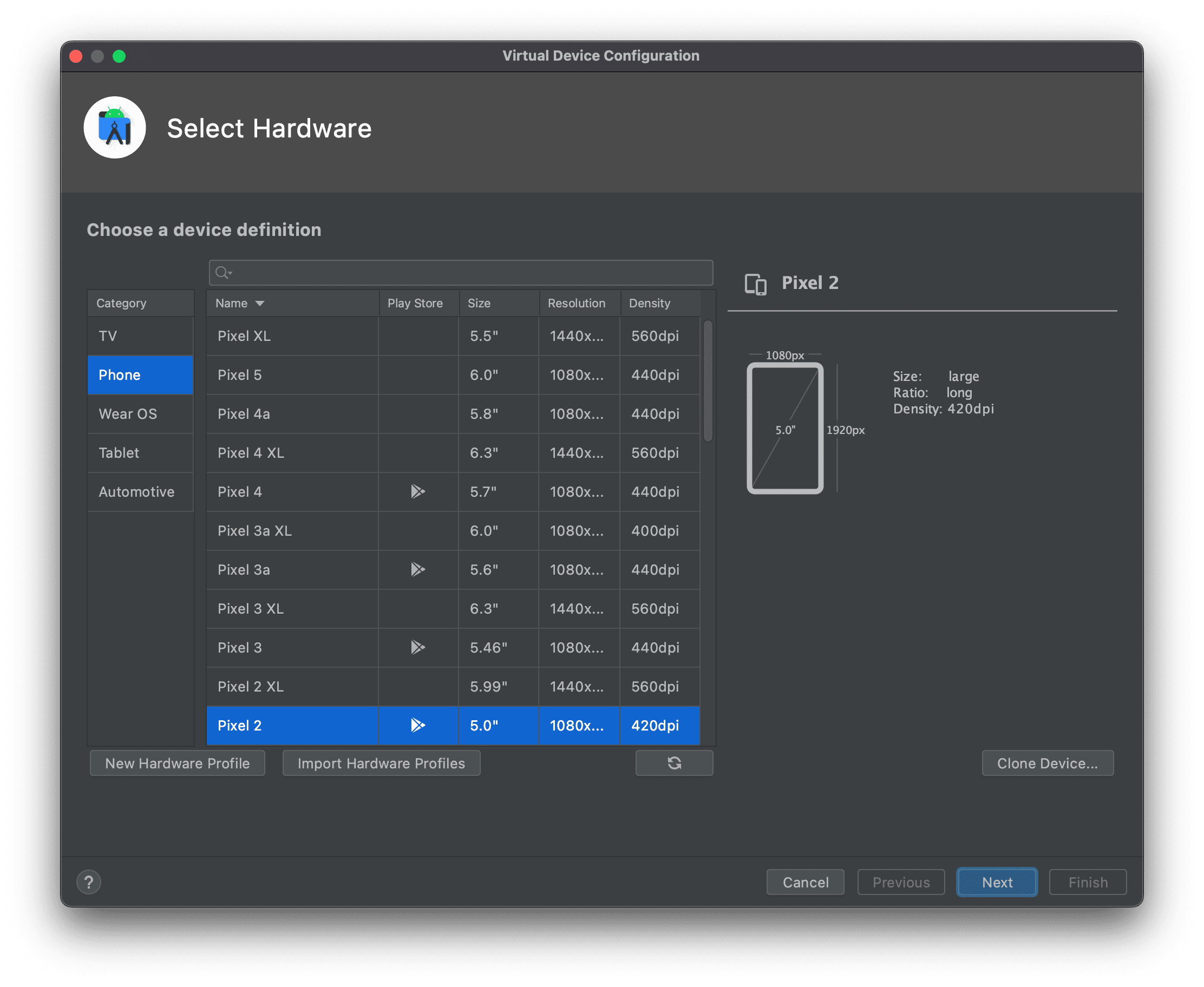 하드웨어와 안드로이드 버전을 선택했다면 최종적으로 안드로이드 가상 머신의 환경을 설정하는 화면이 보입니다. 최종적으로 가상 디바이스의 구성을 확인하고 이름을 정의하고 Finish 버튼을 눌러 마무리해주세요.
