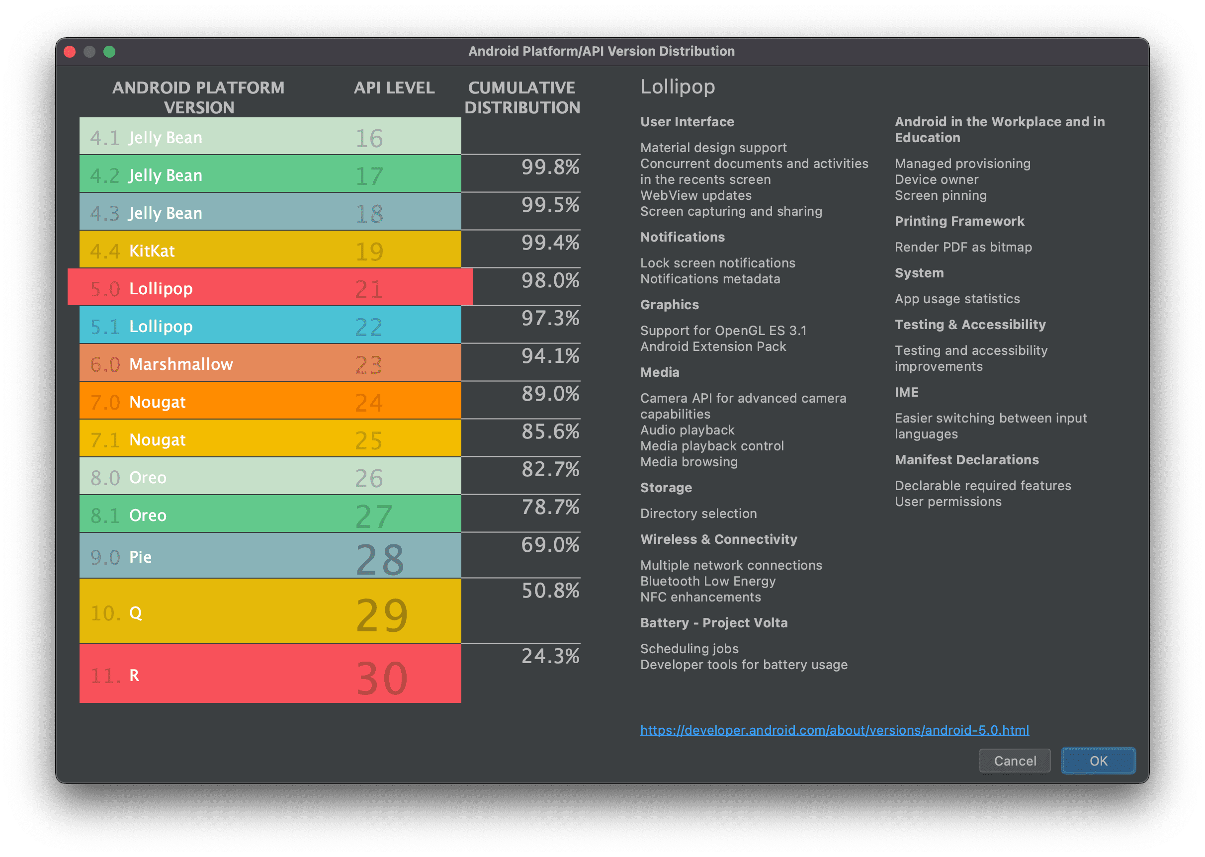Help me choose 버튼을 누르면 현재 안드로이드 OS 버전별 점유율을 확인할 수 있습니다. 자신이 개발하는 앱이 어느 버전까지 지원하면 좋을지 판단할 때 좋은 자료입니다.