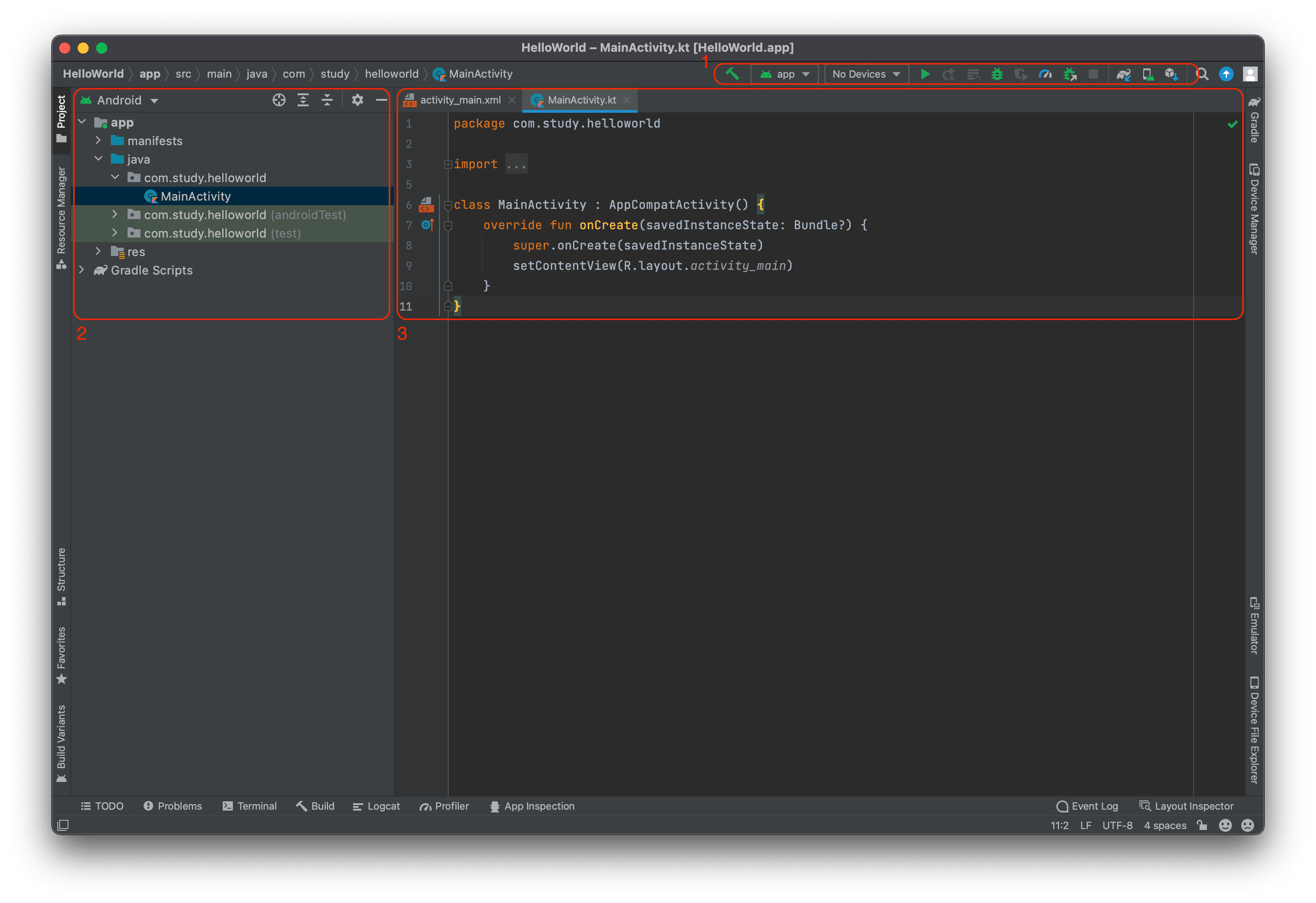 앞서 가상 디바이스 매니저를 이용해 가상 디바이스를 만들었다면 만든 프로젝트를 실행해보도록 하겠습니다. 빈 액티비티(Empty Activity)로 안드로이드 앱 프로젝트를 만들었기 때문에 코드는 수정하지 않고 바로 프로젝트를 실행해보겠습니다.