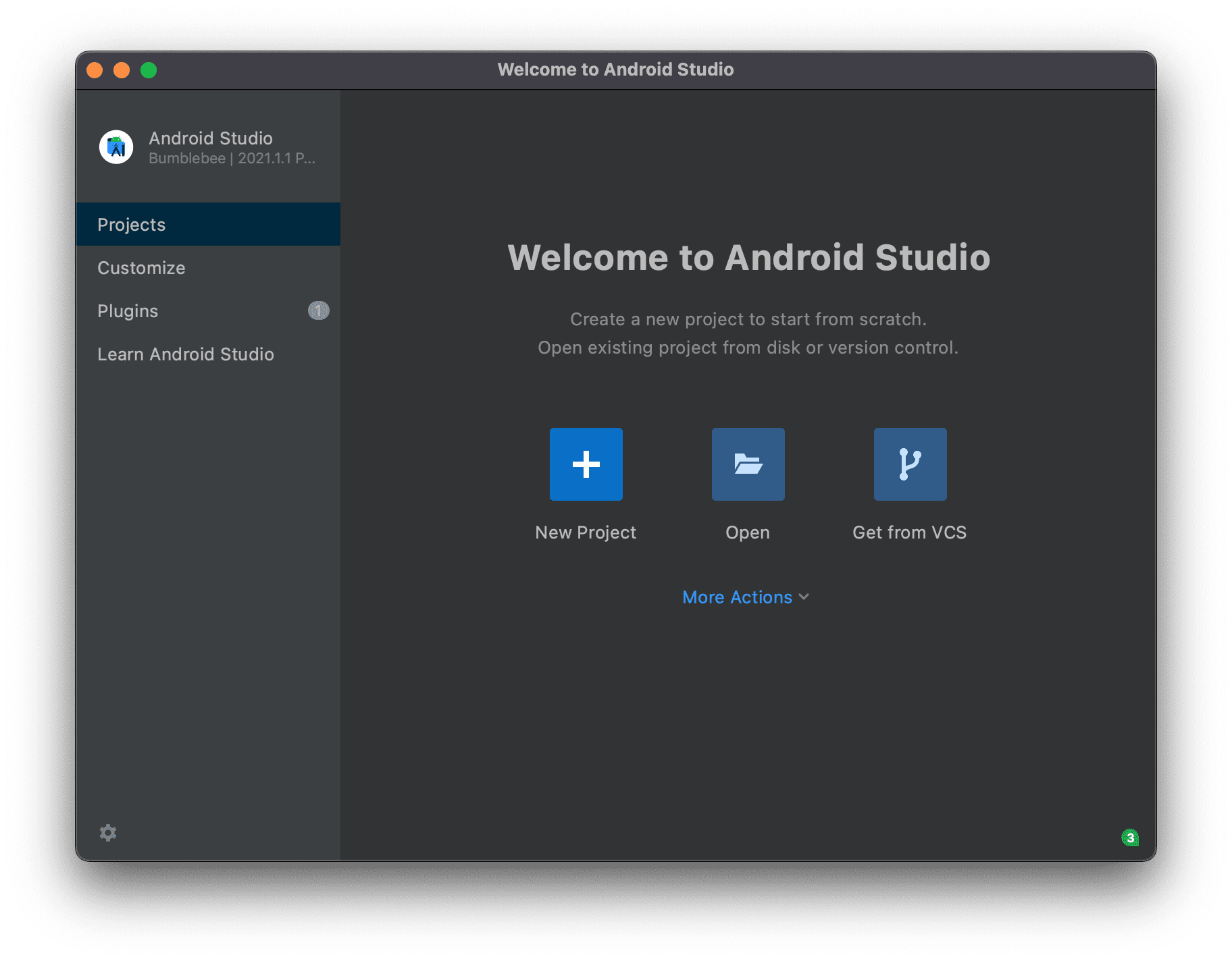 안드로이드 스튜디오를 설치하고 실행하면 위와 같은 화면이 보입니다. New Project는 신규 안드로이드 앱 프로젝트를 생성할 수 있고, Open은 컴퓨터에 저장되어 있는 기존에 사용하던 앱 프로젝트를 열 수 있습니다. Get from VCS는 Git, SVN과 같은 버전 관리 시스템 저장소에서 프로젝트를 가져와 사용할 수 있는 기능입니다.
