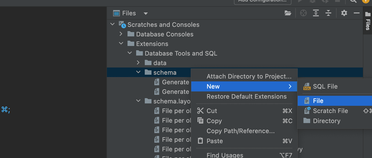 코틀린용 스크립트를 작성했다면 DataGrip에서 사용할 수 있도록 추가를 해주어야 합니다. 스크립트 파일을 추가하는 방법은 DataGrip의 상당 우측에 위치한 Files 탭을 클릭 후 Files 창이 활성화되면 위와 같이 Extensions > Database Tools and SQL > schema 위치에 코틀린용 변환 스크립트 코드를 넣어주면 됩니다.