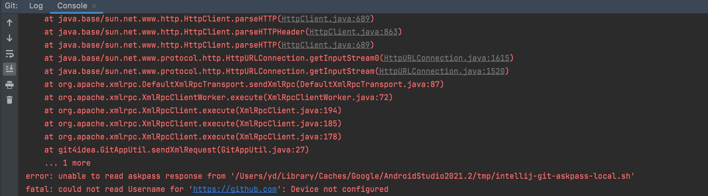 error: unable to read askpass response from '/Users/yd/Library/Caches/Google/AndroidStudio2021.2/tmp/intellij-git-askpass-local.sh'