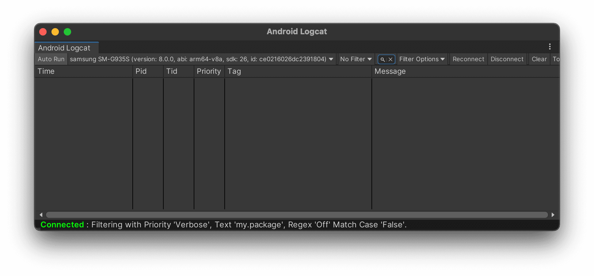 4. Android Logcat 창이 활성화되면, 유니티로 만든 앱의 로그를 확인할 수 있습니다.