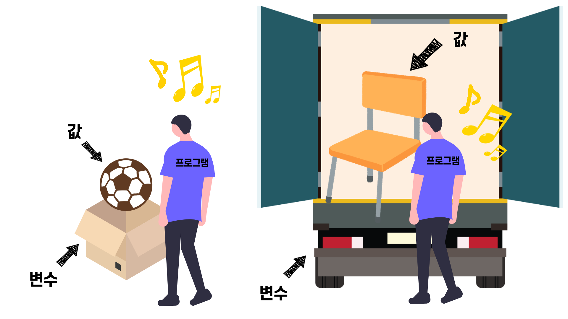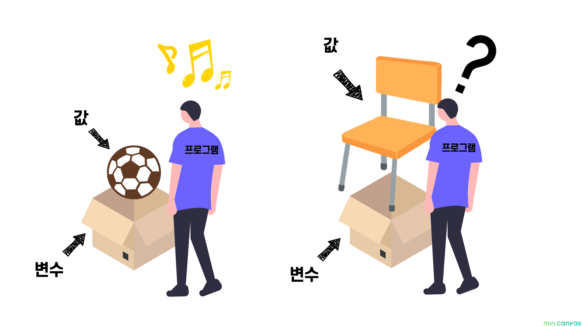 변수에 저장하는 형과 값이 맞지 않는 경우 변수는 값을 가질 수 없고 값도 변수에게 전달 될 수 없습니다. 그렇기 때문에 변수 타입과 값은 서로에게 상호보완적인 요소로 사용됩니다.