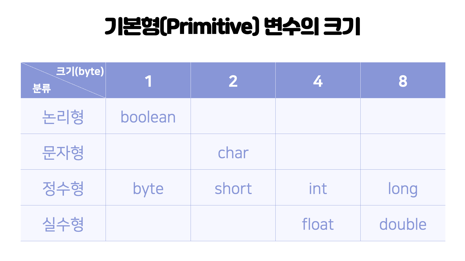 기본형은 실제 값(데이터)를 담을 수 있는 변수의 타입입니다. 기본형의 개수는 총 8개로 구분하며 크게는 논리형, 문자형, 정수형, 실수형으로 구분할 수 있습니다. 간단하게 요약해보면 아래와 같이 설명이 가능합니다.