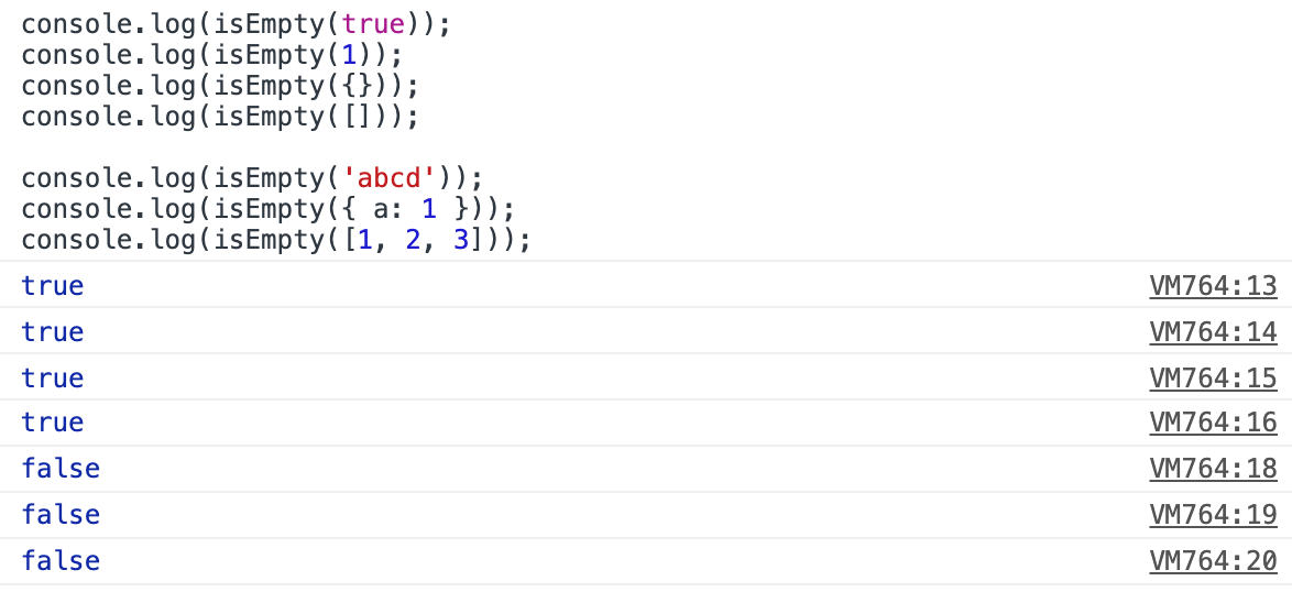 null, undefined, 빈 값을 확인해볼 수 있는 함수를 만들어 보았습니다. 특정 값들을 넣어서 테스트를 해보면 아래와 같은 결과를 얻을 수 있습니다.