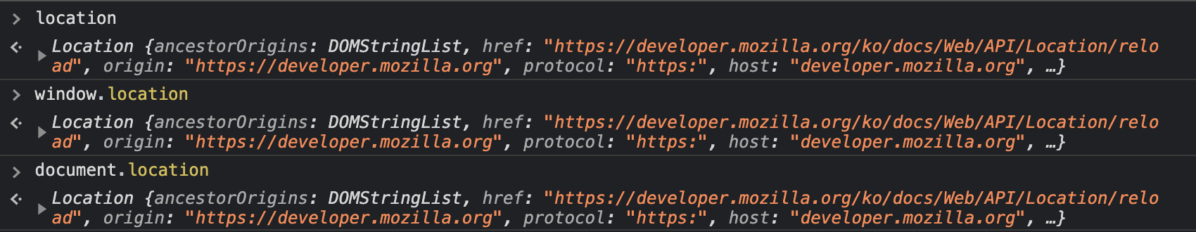 location, window.location, document.location를 일치 연산자를 이용해 비교해보면 동일하다는 것을 알 수 있습니다.