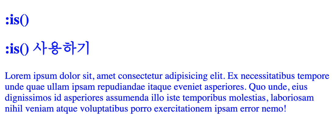 이렇게만 두고 보면 :where()와 다른 점을 찾기가 어렵습니다. where가 is로 수정이 된 부분 말고는 나머지는 내용이 동일합니다. is()는 기본적으로 :where()와 같은 동작을 합니다.