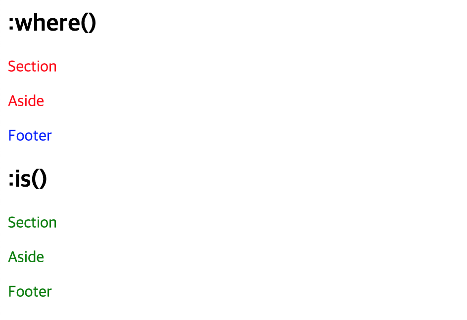 :where()와 :is()의 차이점은 위의 예제 코드를 실행하면 쉽게 알 수 있습니다. <section>, <aside>, <footer>를 :where()와 :is()를 사용해 글자색을 변경하면 다음과 같은 결과를 얻을 수 있습니다.