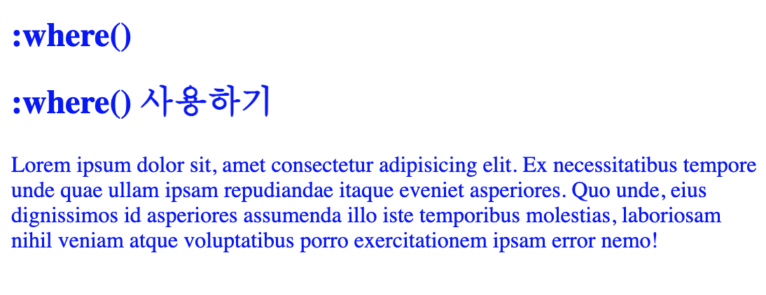 앞서 작성한 예제 코드를 :where()를 사용해서 다시 작성한 예제 코드입니다. 여기서 article 요소 선택자는 한 번만 사용됩니다. 즉 :where()는 불필요한 중복을 없앨 수 있다는 사실을 알 수 있습니다.