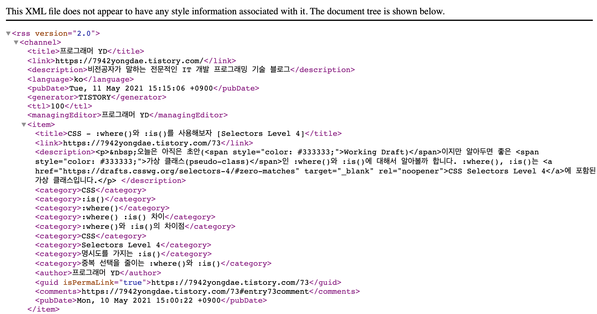 위의 내용은 RSS 2.0의 일부 규격을 구현한 내용입니다. RSS는 XML의 형태를 가져야 하며, W3C(World Wide Web)에서 게시된 XML 1.0의 사양을 따라야 합니다.