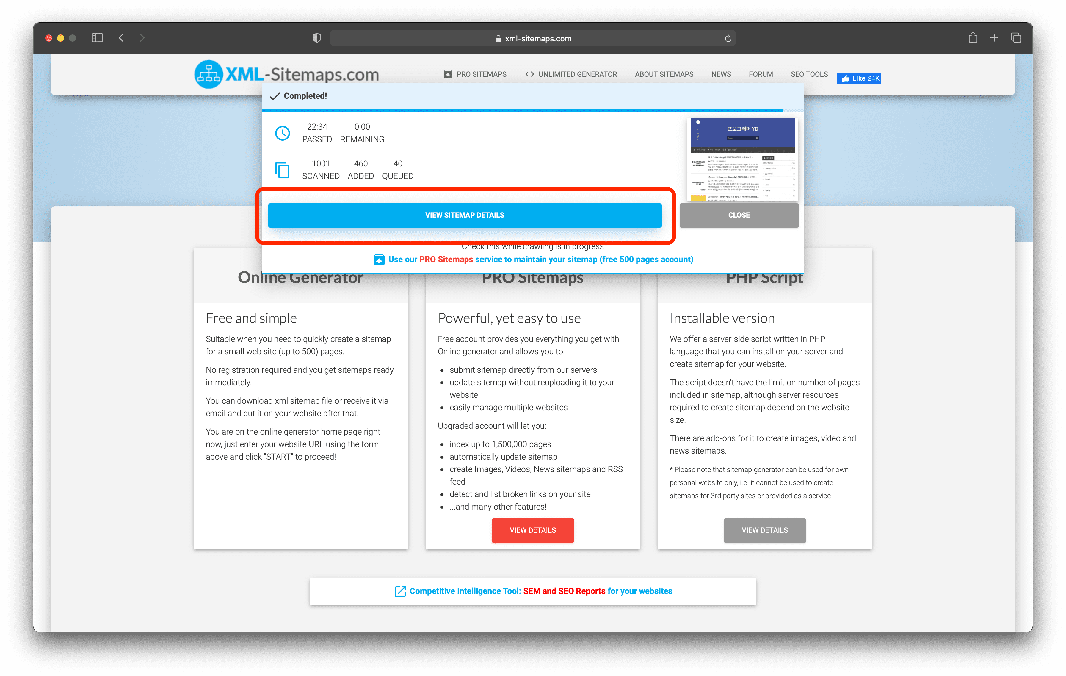 5. 사이트 맵 생성이 요청이 완료되면 VIEW SITEMAP DETAILS 버튼을 누른다.