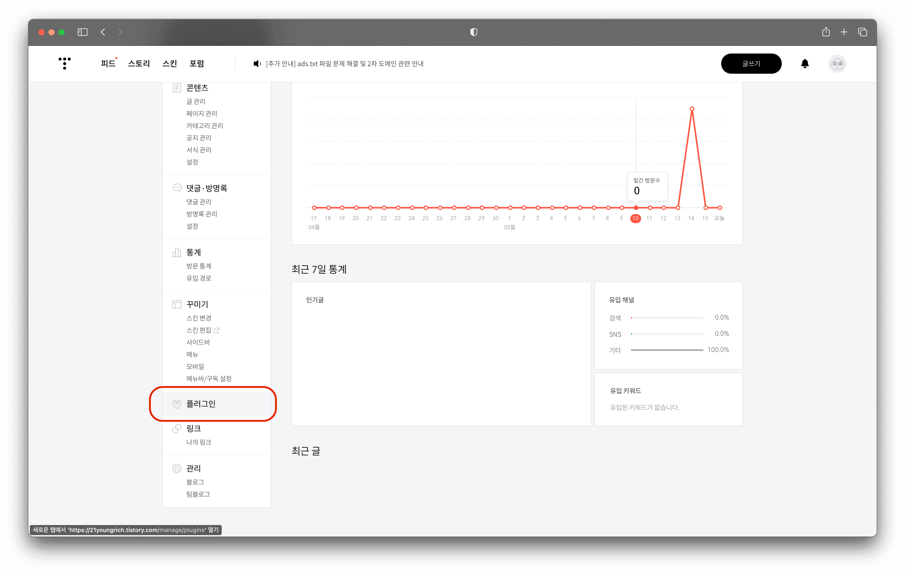 1. 블로그 관리 > 플러그인 페이지로 이동하기