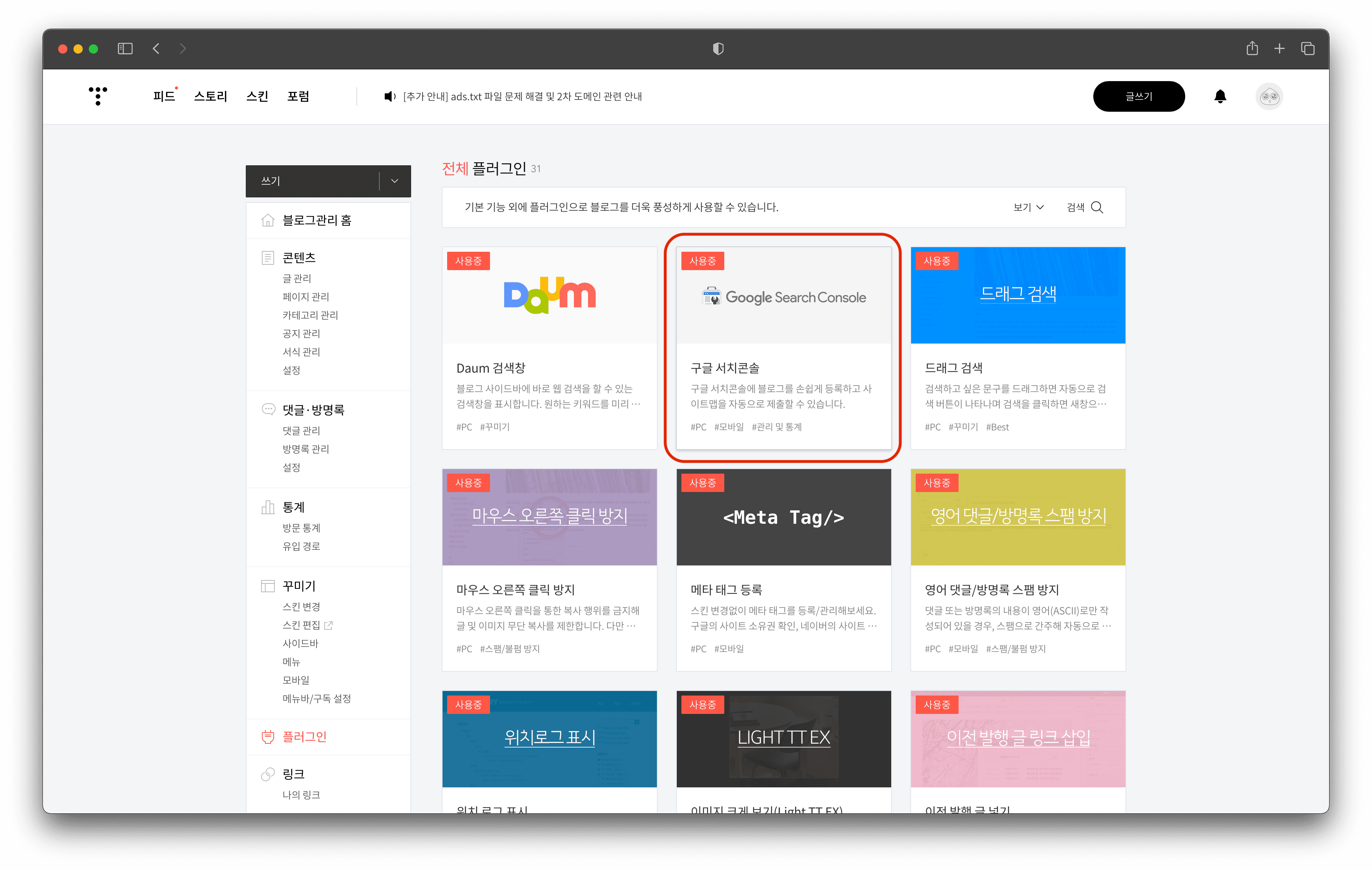 구글 서치 콘솔 연결 적용하기가 문제없이 실행되면 블로그 관리 > 플러그인 화면에서 아래와 같이 사용중이 표기된 화면을 볼 수 있습니다. 만약 구글 서치 콘솔에 사용중이 표기되지 않았다면 정상적으로 적용이 되지 않았음을 의미합니다.