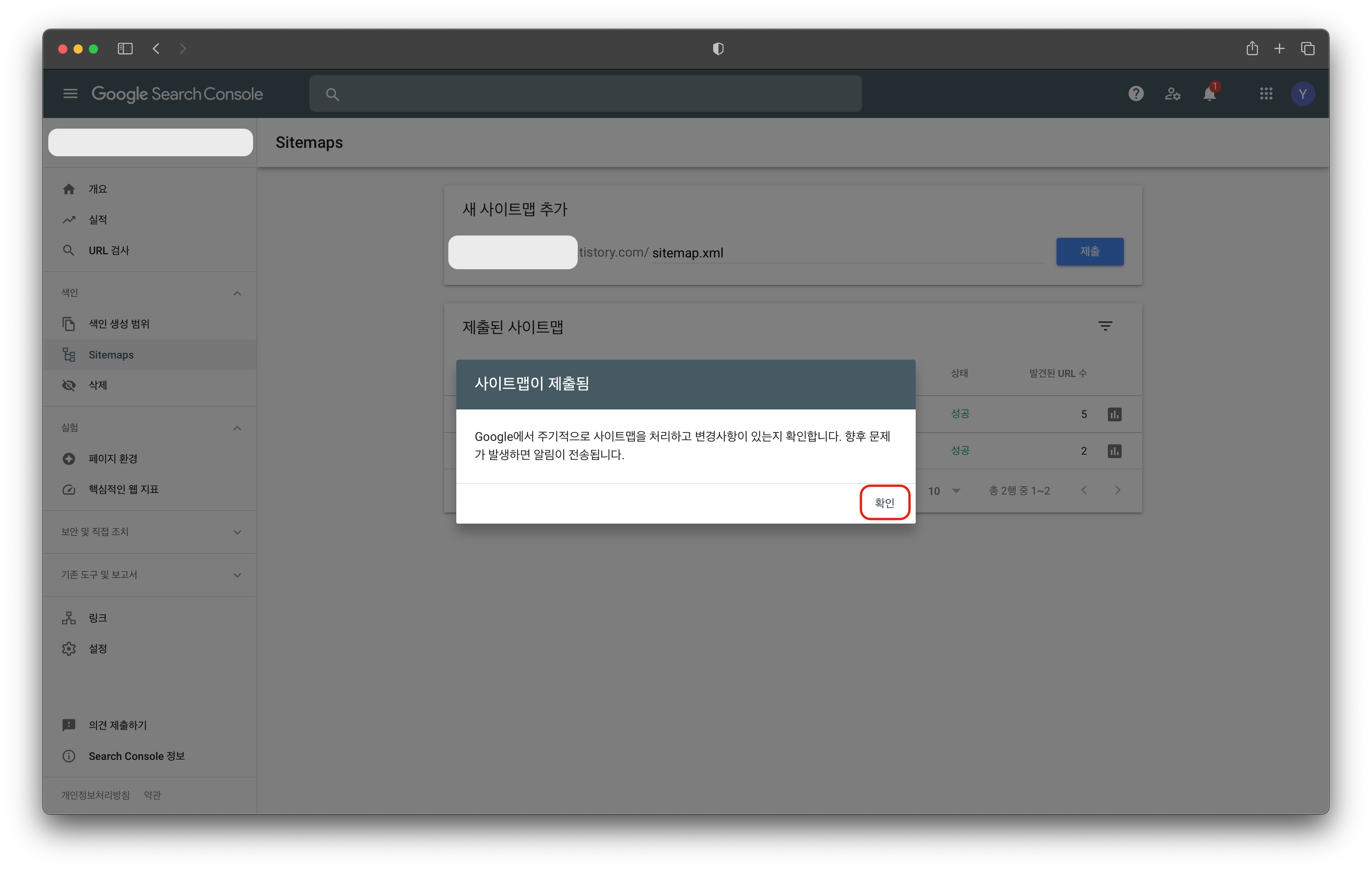 sitemap.xml 제출(등록)이 완료되면 사이트맵이 제출됨 이라는 팝업 창이 표시됩니다. 확인 버튼을 눌러 닫아주세요.