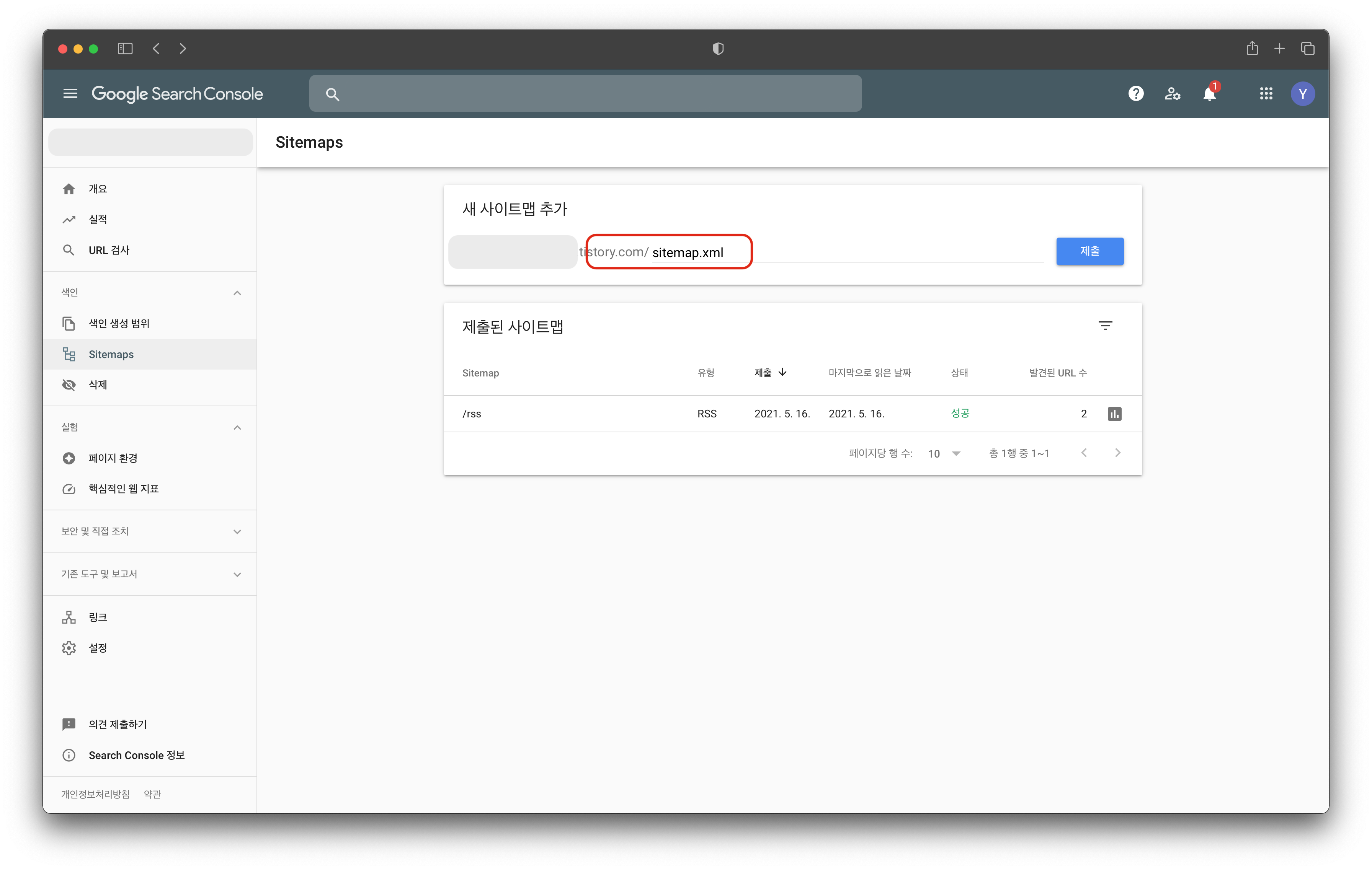 2. 새 사이트맵 추가 기입란에 rss를 입력 및 제출