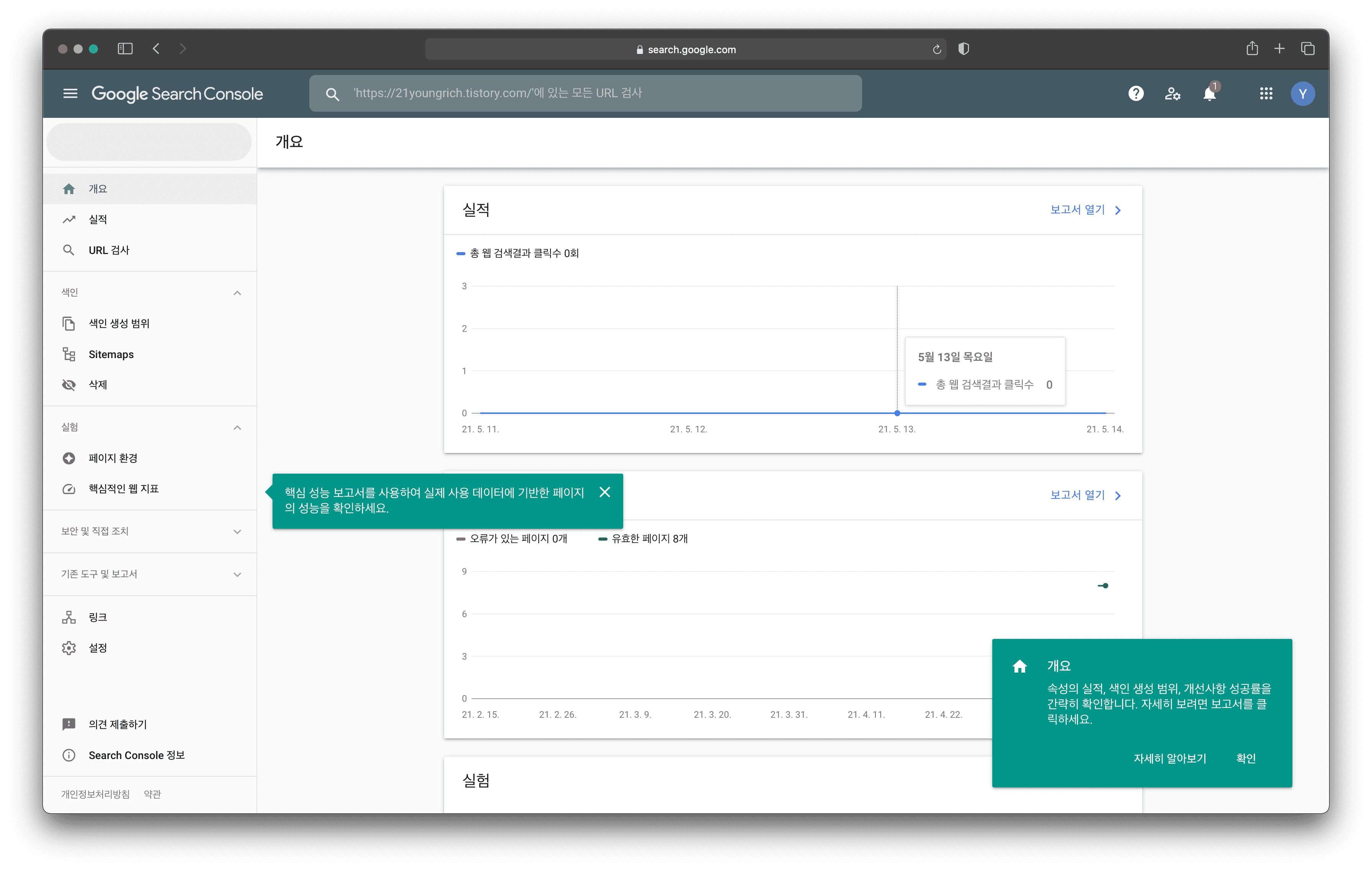 구글 서치 콘솔을 이용해 구글 검색과 관련된 내용을 확인할 수 있는 페이지입니다. RSS와 사이트 맵을 등록하기 위해서는