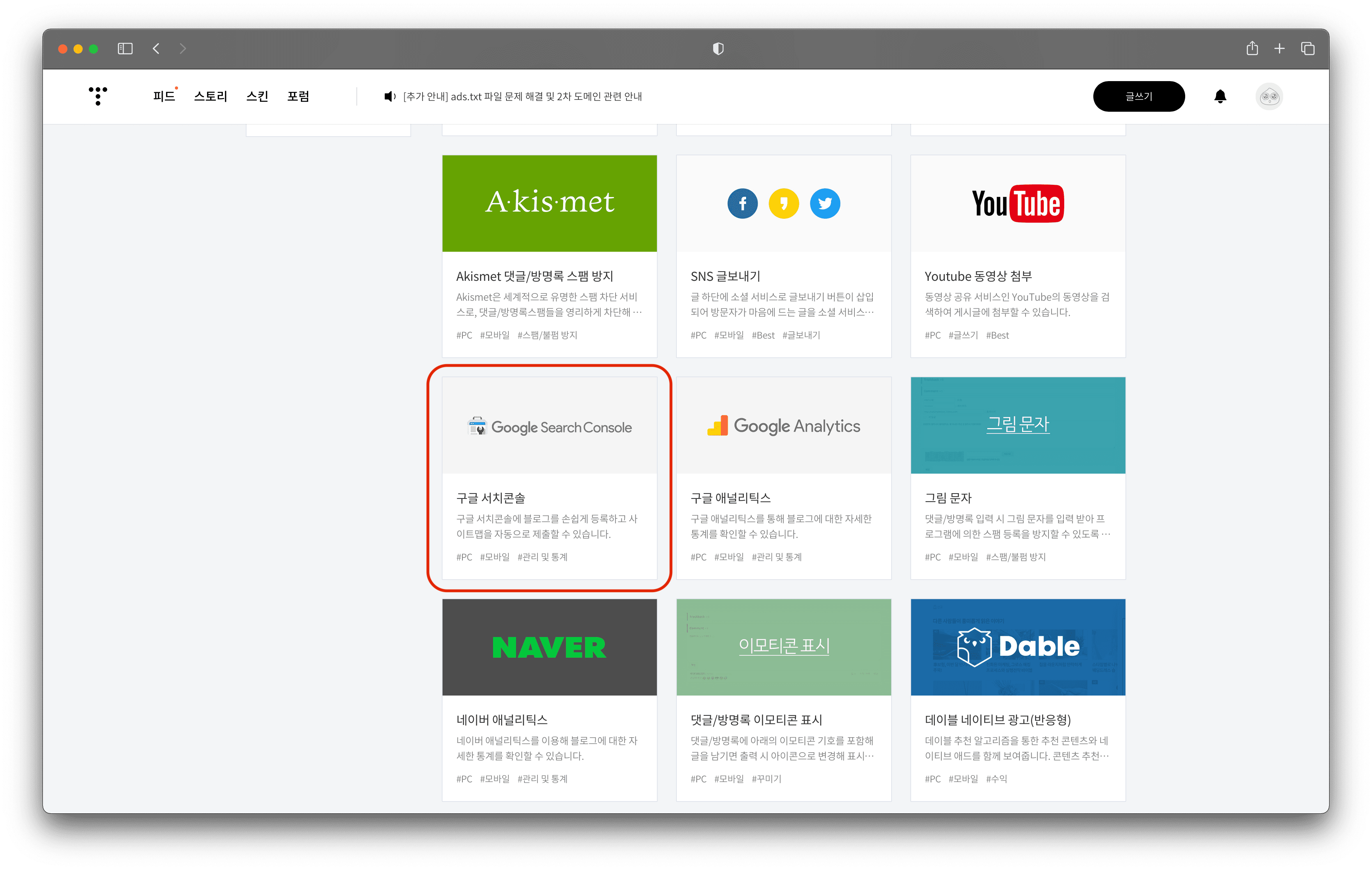 티스토리 블로그 같은 경우 플러그인을 통해 구글 서치 콘솔을 쉽게 연동할 수 있도록 되어 있습니다. 플러그인을 사용하지 않고도 구글 서치 콘솔을 연동하는 방법이 있지만, 이 방법은 코드를 삽입하거나 DNS를 설정해야 하는 번거로움이 있으니 플러그인을 사용하시는 게 좋습니다. 다만 구글 애널리틱스를 사용 중이시라면 플러그인보다는 직접 연결하시는 게 좋을 수 있습니다.