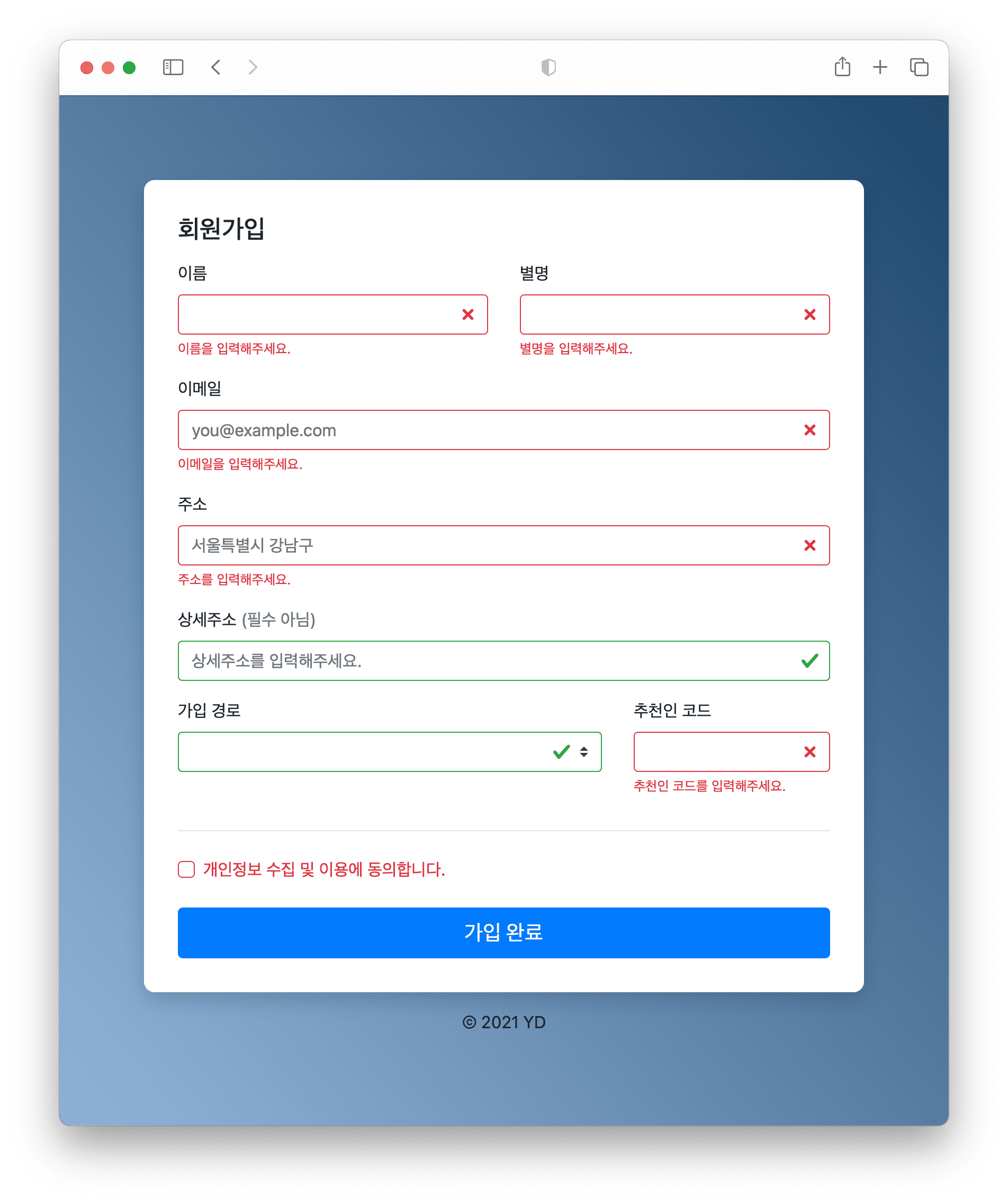 이전에 프로젝트를 진행하면서 회원 가입 화면을 만들 때, 회원 가입 양식 예제 코드를 한번 만들어보면 좋을 것 같다는 생각이 들었습니다. 검색을 통해서 찾을 수 있는 괜찮은 자료들이 없기도하고, 한번 정리해보면 좋을 것 같다고 판단해서였습니다. 이 글에서는 유효성 검사를 포함한 회원가입 양식 화면을 만들어보았습니다.