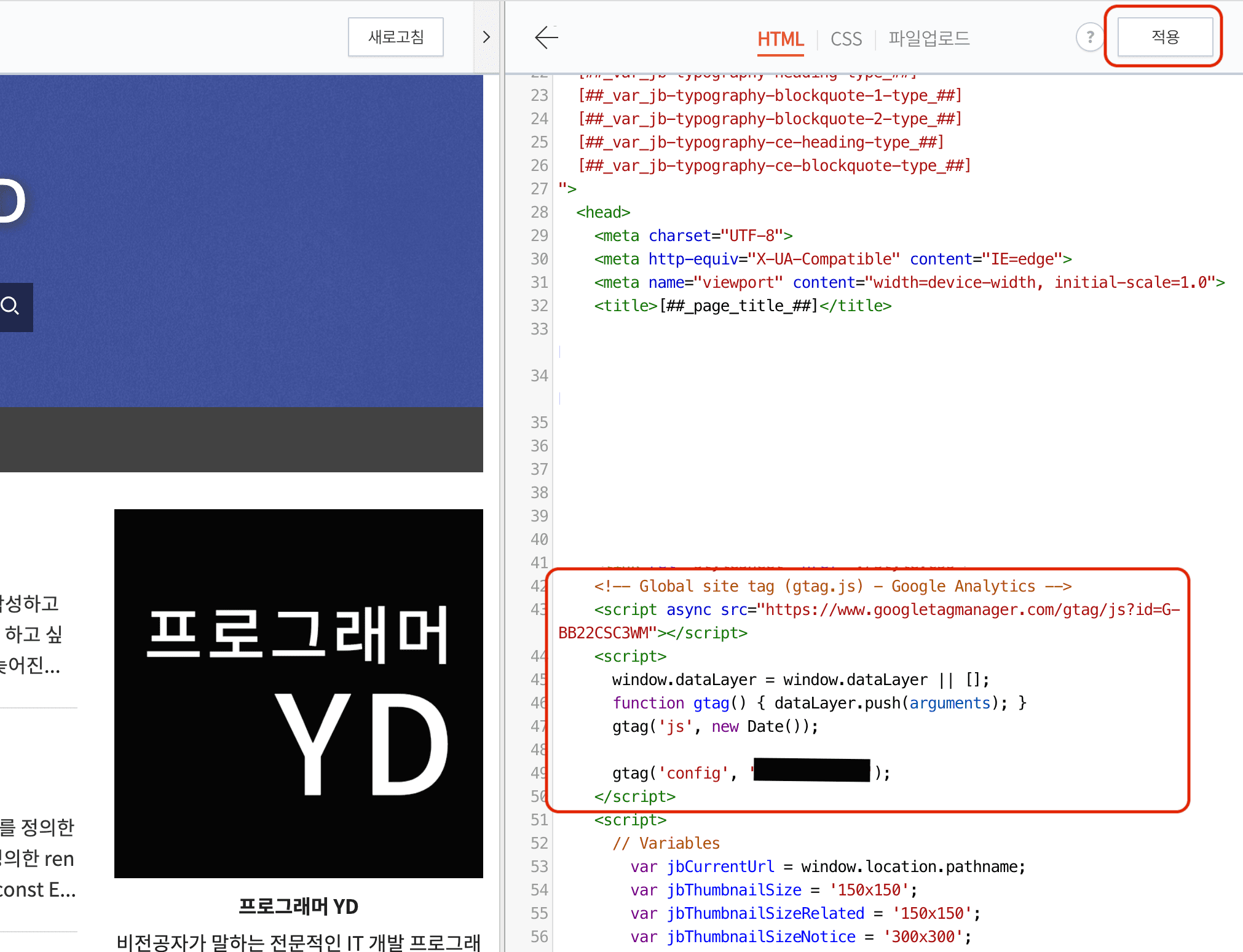 3. html 편집 기능을 통해 gtag.js 코드 적용
