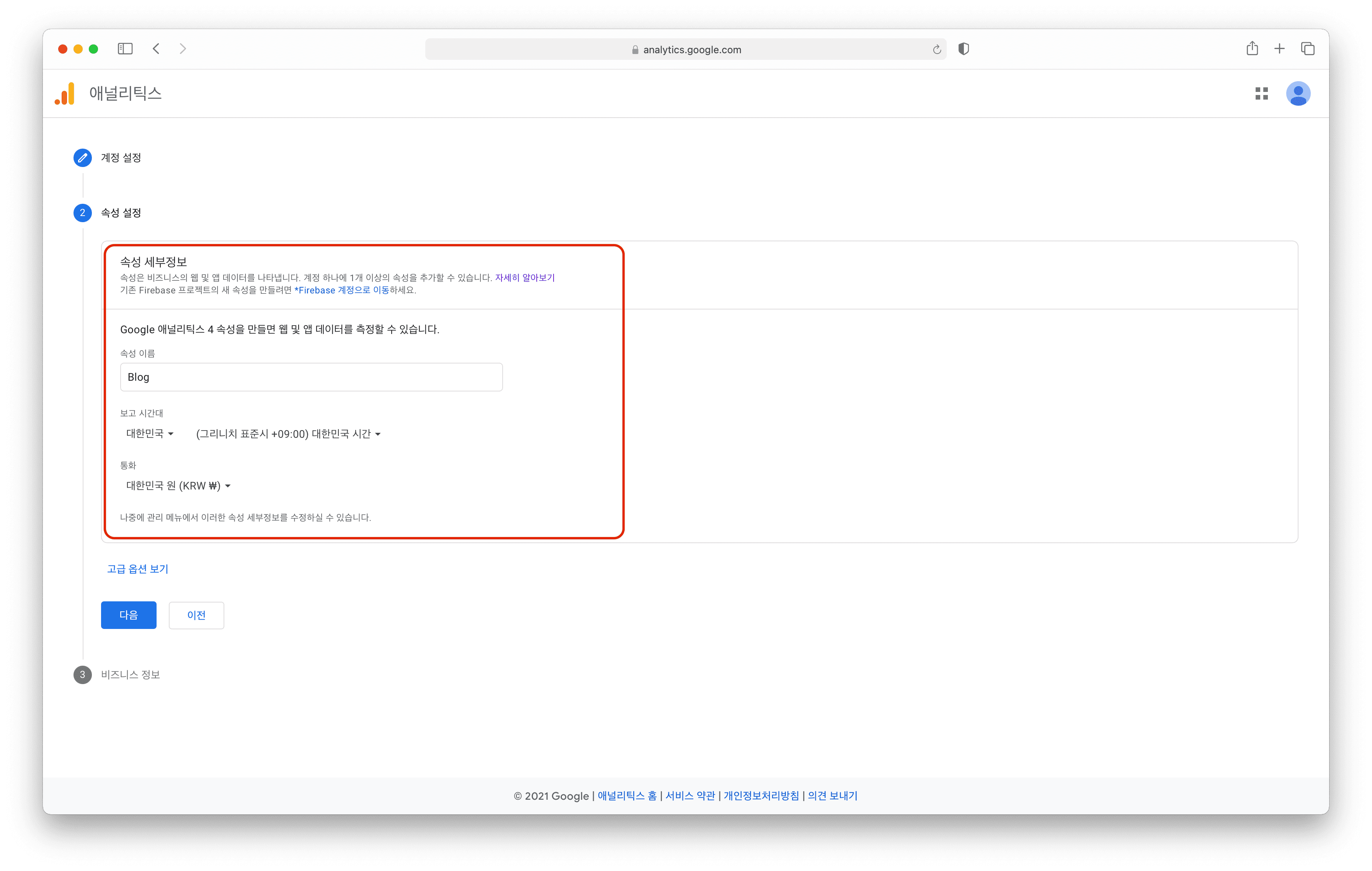 계정에 설정할 속성을 설정합니다. GA에서 이야기하는 속성은 로그를 쌓을 대상을 의미합니다. GA는 웹 말고도 사용자 데이터를 분석할 수 있는 서비스라면 어디든 적용할 수 있기 때문에 그 대상을 웹이라고 지칭하지 않고 속성이라는 단어를 사용합니다. 우리는 여기서 웹 사이트를 기준으로 GA를 이야기하고 있기 때문에 쉽게 이해하기 위해 속성을 웹 사이트로 생각하시는 게 편합니다. 계정은 한 개 이상의 속성을 가질 수 있습니다.