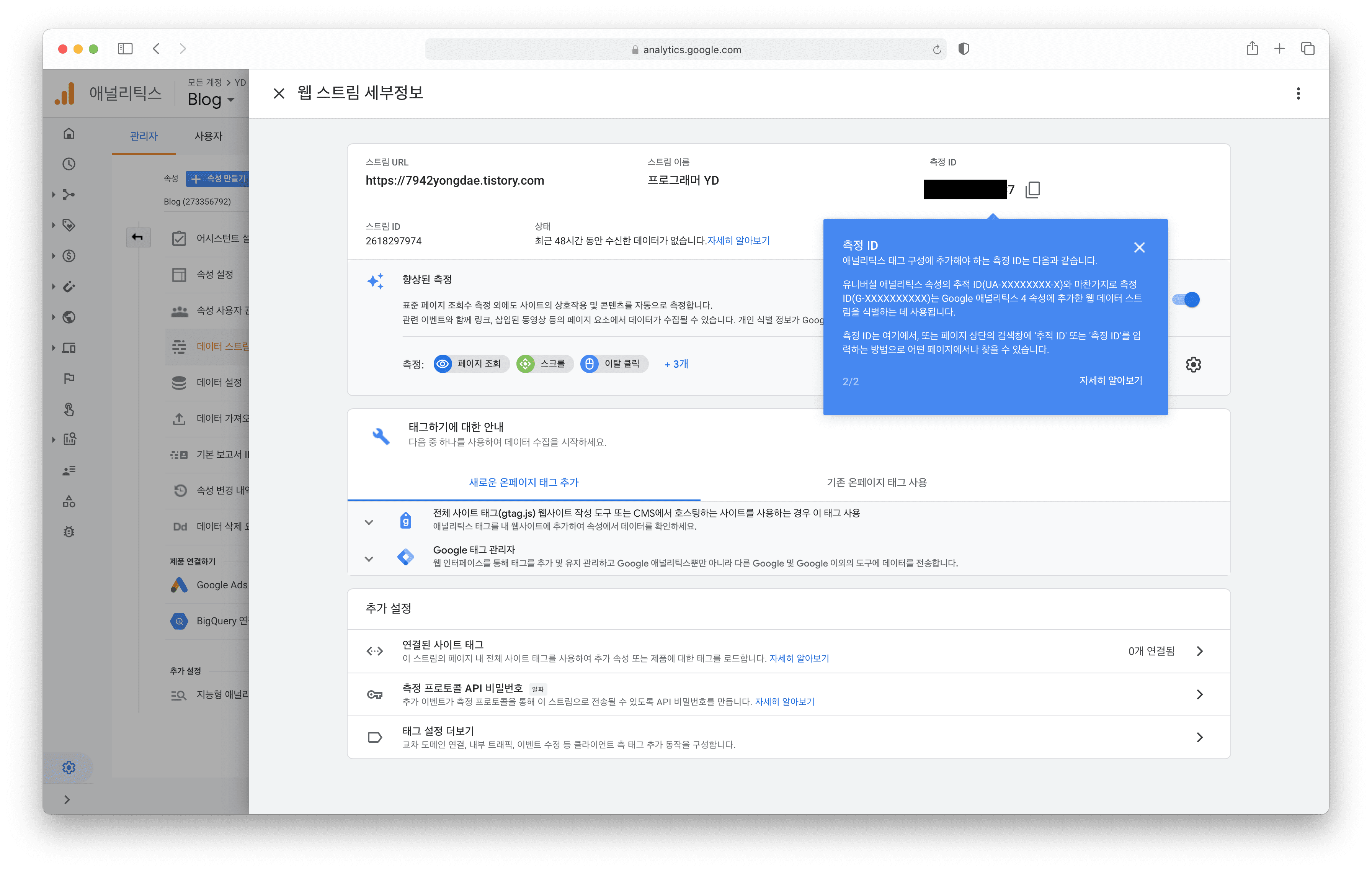 앞서 이야기한 단계들을 진행하셨다면 현재는 자신이 운영하는 웹 사이트나 블로그에 스트림을 연결할 준비가 완료된 상태입니다. 이번 단계에서는 현재 준비된 재료들을 이용해서 GA의 사용자 데이터 측정이 가능하도록 GA와 웹 사이트를 연결해보도록 하겠습니다.