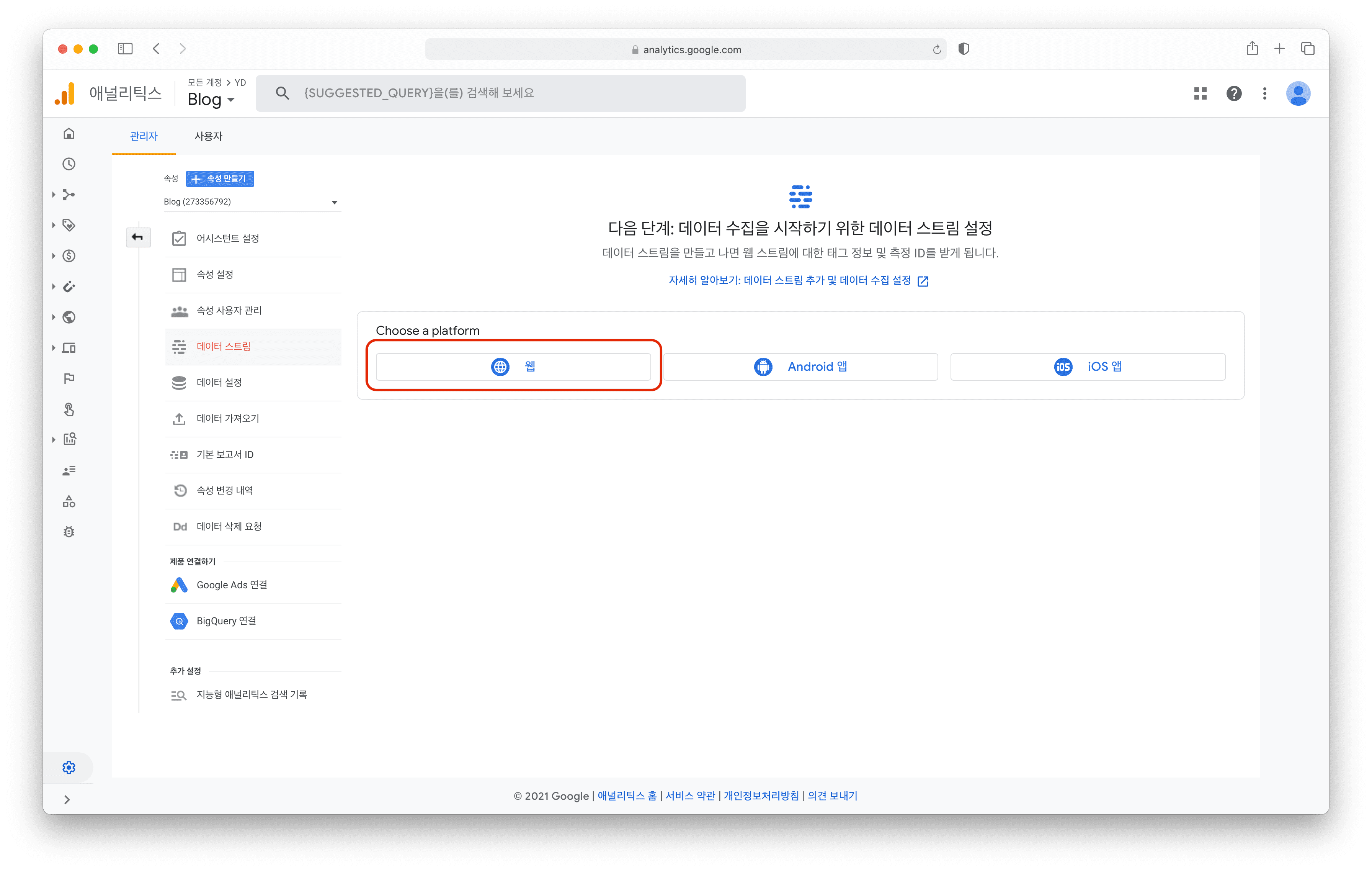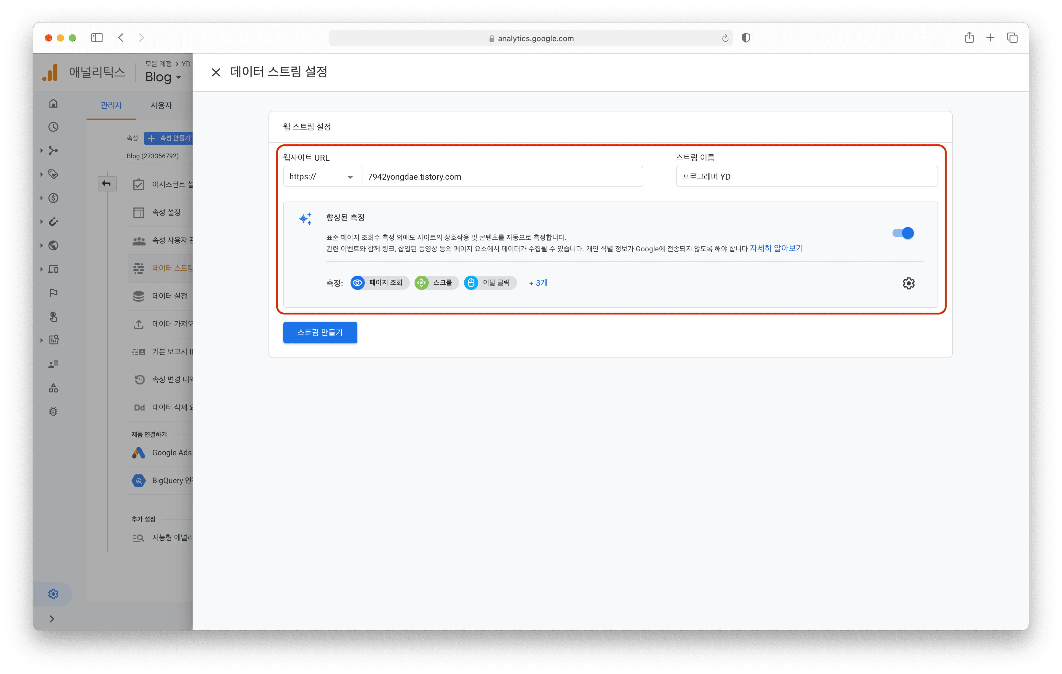 운영하는 서비스에 GA 적용을 위한 데이터 스트림 만들기