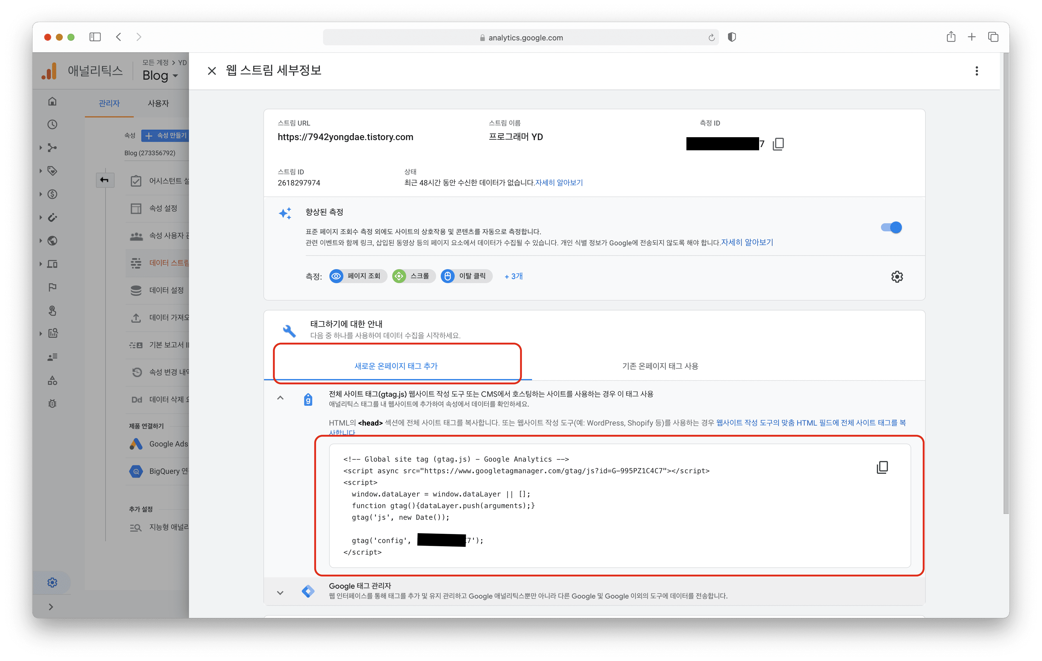 앞서 이야기한 단계들을 진행하셨다면 현재는 자신이 운영하는 웹 사이트나 블로그에 스트림을 연결할 준비가 완료된 상태입니다. 이번 단계에서는 현재 준비된 재료들을 이용해서 GA의 사용자 데이터 측정이 가능하도록 GA와 웹 사이트를 연결해보도록 하겠습니다.