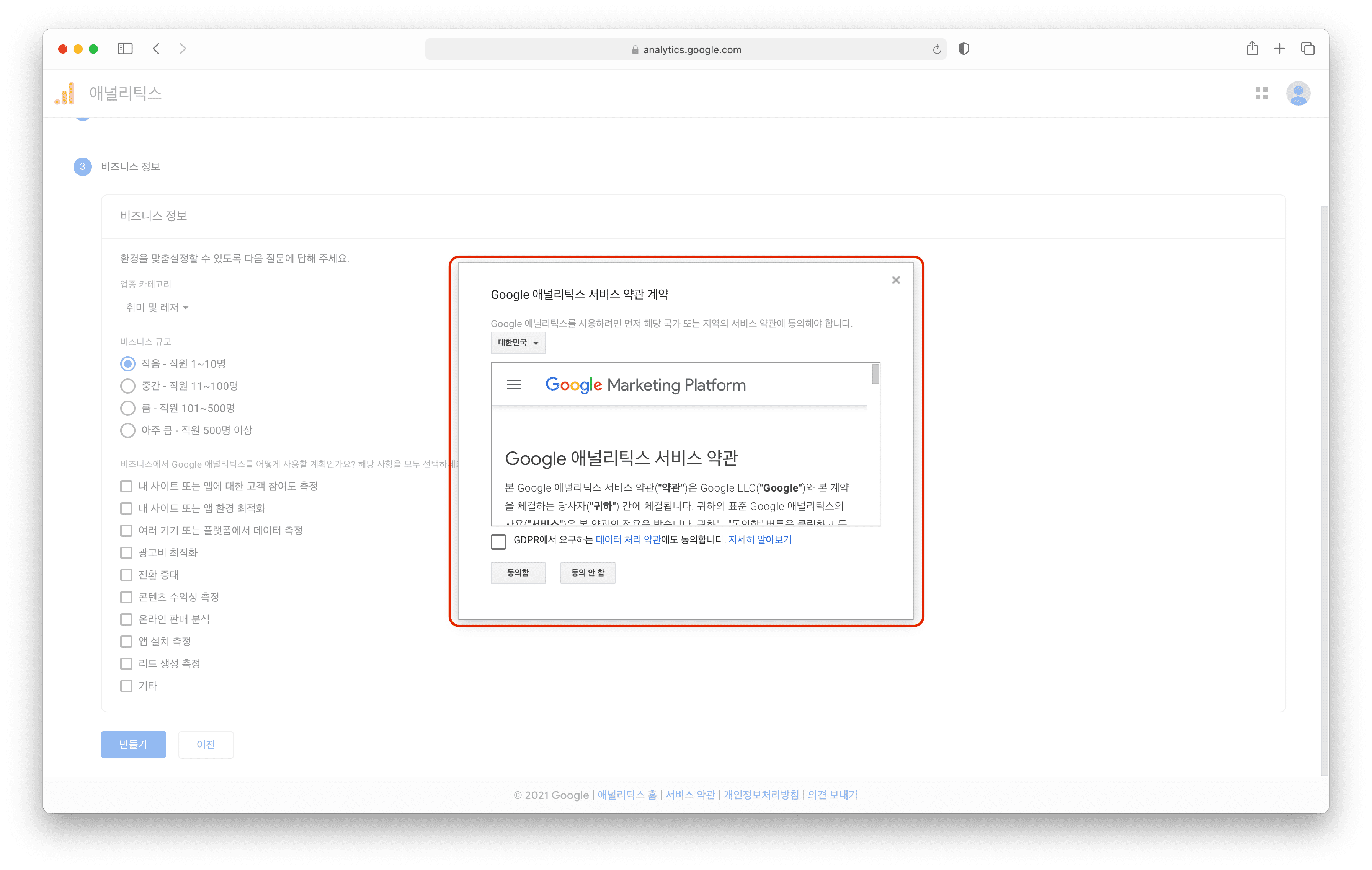 GA를 사용하기 위해서는 서비스 이용약관을 동의해야 합니다. 일반적인 서비스들도 사용을 하려면 약관 동의를 해야 하지만, GA는 개인정보와도 밀접한 관련이 있다는 부분을 인지해주시는 게 좋습니다.