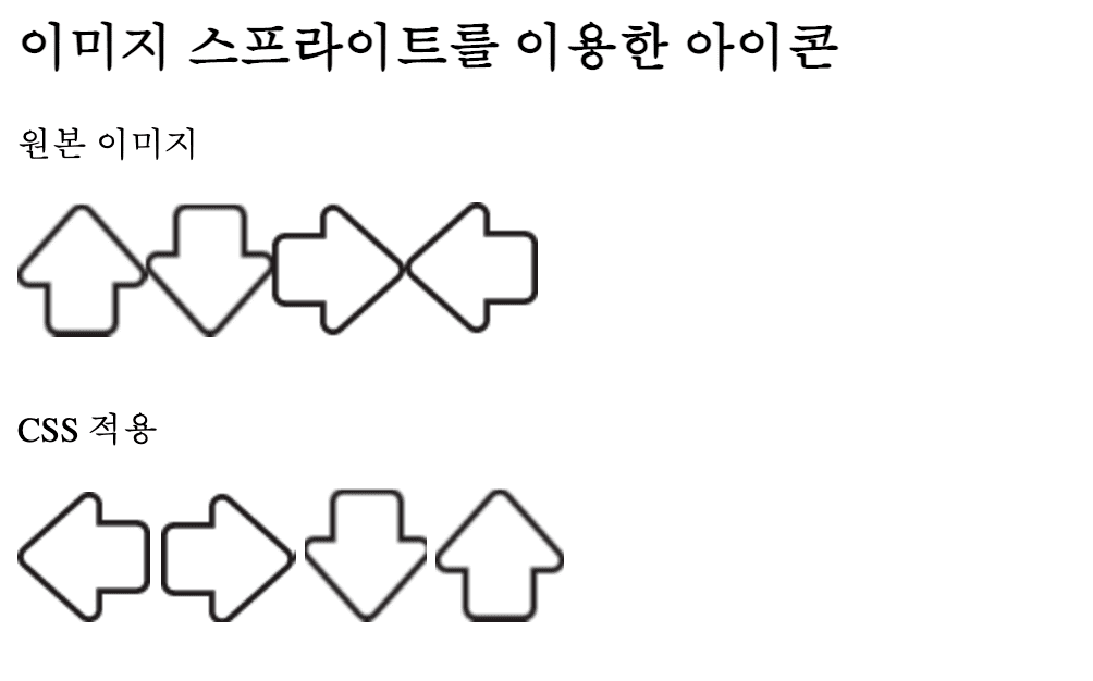 이미지 스프라이트를 사용하는 경우 CSS의 backgroud와 backgroud-position 속성 설정을 통해 하나의 이미지로 보이게 할 수 있습니다.